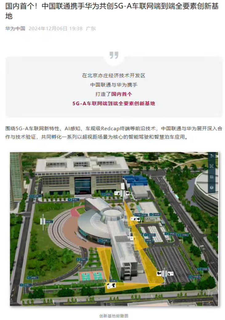 12 月 6 日消息,華為官方宣布與中國聯(lián)通在北京亦莊經(jīng)濟(jì)技術(shù)開發(fā)區(qū)打造了國內(nèi)首個(gè)5G-A 車聯(lián)網(wǎng)端到端全要素創(chuàng)新基地。