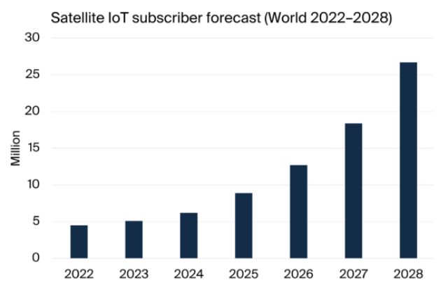 在此之前,Berg Insight 發(fā)布的衛(wèi)星物聯(lián)網(wǎng)研究報(bào)告顯示,全球衛(wèi)星物聯(lián)網(wǎng)用戶數(shù)在 2023 年超過 510 萬,預(yù)計(jì)到 2028 年將飆升至 2670 萬,復(fù)合年增長率 (CAGR) 為 39.2%。