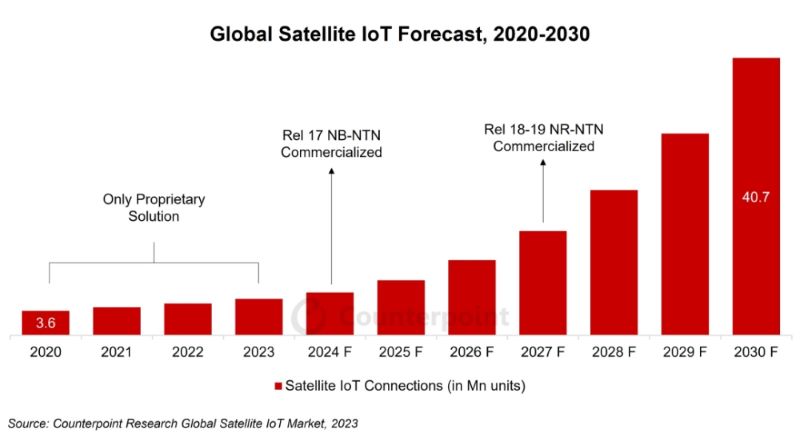 臨近年末,又有研究機(jī)構(gòu)對(duì)衛(wèi)星物聯(lián)網(wǎng)市場的未來發(fā)展給出積極預(yù)測——根據(jù) Counterpoint 最新發(fā)布的《2023 年衛(wèi)星物聯(lián)網(wǎng)生態(tài)系統(tǒng)和市場概況報(bào)告》,全球衛(wèi)星物聯(lián)網(wǎng)連接數(shù)預(yù)計(jì)將從 2020 年的 360 萬個(gè)增長到 2030 年的 4100 萬個(gè),復(fù)合年增長率為 28%。