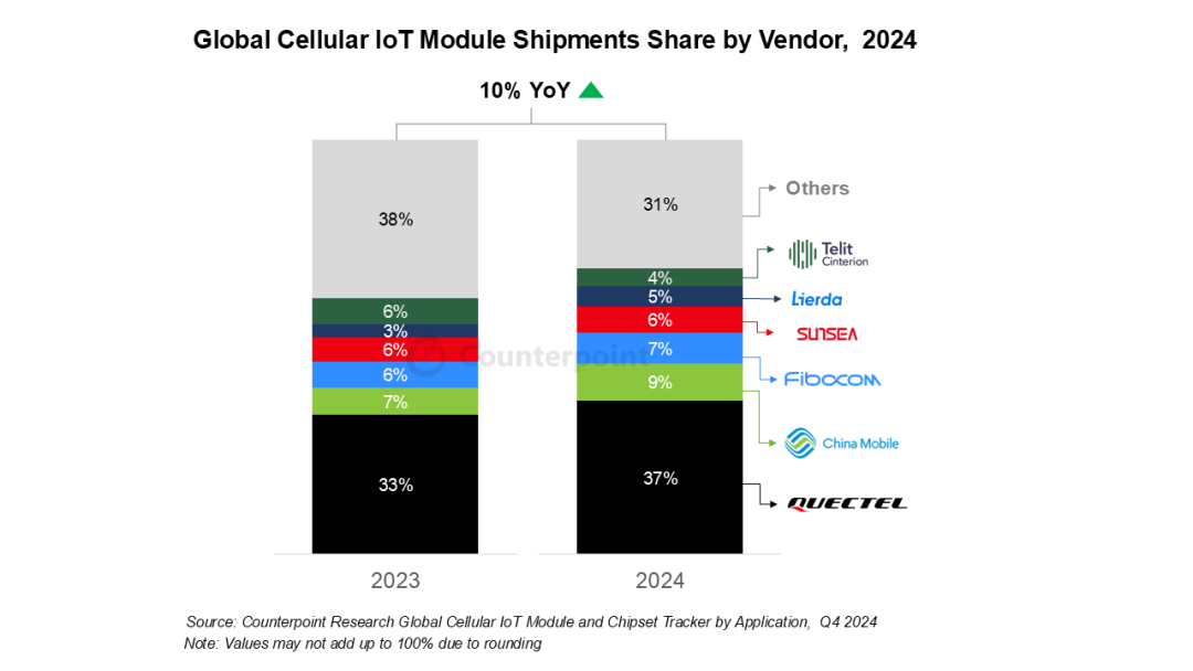 Counterpoint Research數(shù)據(jù)顯示,2024年中國廠商移遠(yuǎn)通信以37%份額繼續(xù)領(lǐng)跑市場(chǎng),中國移動(dòng)和廣和通市場(chǎng)份額分別為9%、7%;這三家公司在2024年占據(jù)了全球一半以上的市場(chǎng)份額。