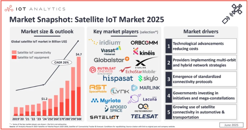 根據(jù)知名物聯(lián)網(wǎng)產(chǎn)業(yè)研究機(jī)構(gòu) IoT Analytics 于 2025 年 6 月最新發(fā)布的《2025–2030 年衛(wèi)星物聯(lián)網(wǎng)市場(chǎng)報(bào)告》,2024 年全球衛(wèi)星物聯(lián)網(wǎng)連接數(shù)已達(dá) 750 萬(wàn)。IoT Analytics 預(yù)測(cè),衛(wèi)星物聯(lián)網(wǎng)連接數(shù)還將持續(xù)強(qiáng)勁增長(zhǎng),帶動(dòng)衛(wèi)星網(wǎng)絡(luò)運(yùn)營(yíng)商(SNO)與設(shè)備供應(yīng)商的綜合收入以 26% 的年復(fù)合增長(zhǎng)率(CAGR)增長(zhǎng),至 2030 年市場(chǎng)規(guī)模將超過(guò) 47 億美元。