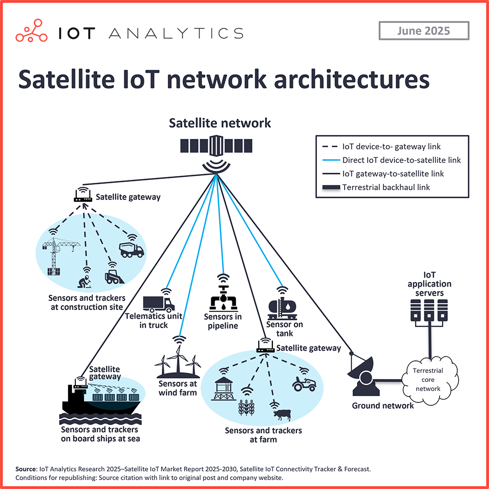 典型衛(wèi)星物聯(lián)網(wǎng)連接場(chǎng)景圖解(來(lái)源:IoT Analytics)