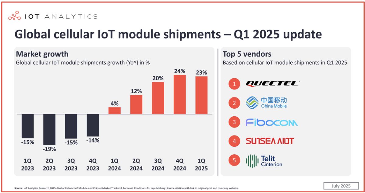 C114訊 7月8日消息(顏翊)根據(jù)IoT Analytics最新研究,2025年第一季度全球蜂窩物聯(lián)網(wǎng)模塊出貨量同比增長(zhǎng)23%,這是連續(xù)第五個(gè)季度增長(zhǎng),表明市場(chǎng)正在從廣泛的庫(kù)存調(diào)整中復(fù)蘇。