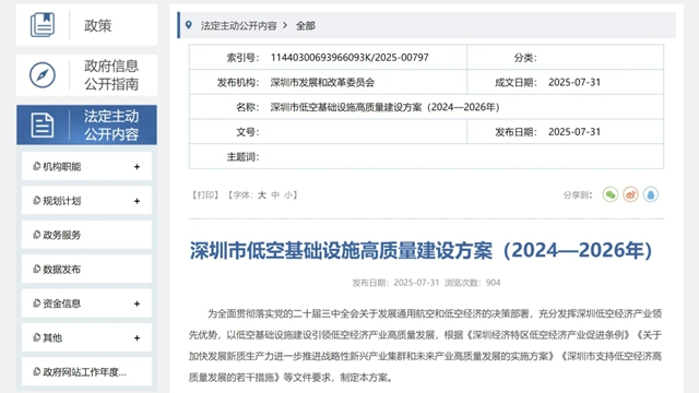 C114訊 7月31日消息(蘭茜)今日,深圳市發(fā)改委發(fā)布《深圳市低空基礎(chǔ)設(shè)施高質(zhì)量建設(shè)方案(2024—2026年)》(以下簡(jiǎn)稱“方案”)。