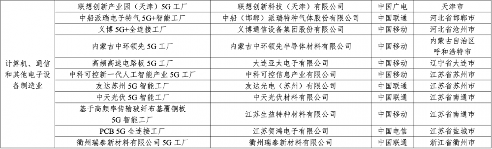 其中,計算機、通信和其他電子設(shè)備制造業(yè)的入選5G工廠包括: