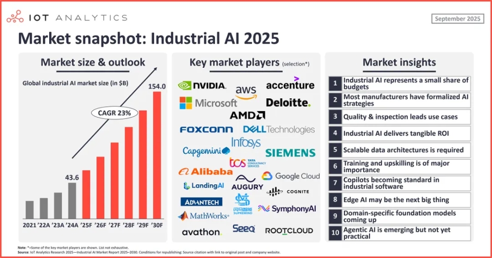根據(jù)IoT Analytics調(diào)研報告顯示,2021年,絕大多數(shù)制造企業(yè)還在將工業(yè)AI視為“實驗項目”或“輔助工具”。但到了2025年,工業(yè)AI已經(jīng)被寫入企業(yè)路線圖,成為董事會和CEO在財報季反復(fù)討論的關(guān)鍵議題。