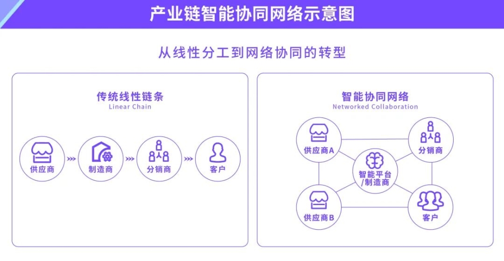 這種改變,不只是管理流程的升級、局部環(huán)節(jié)的智能化,而是對產(chǎn)業(yè)鏈組織方式、價值分配模式、企業(yè)間協(xié)同機制的根本性重構(gòu),甚至延展到供應(yīng)鏈網(wǎng)絡(luò)的全面重組,以及制造企業(yè)從“產(chǎn)品導(dǎo)向”到“服務(wù)導(dǎo)向”的商業(yè)模式創(chuàng)新。