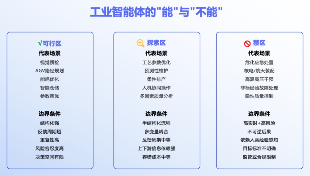 AI擅長處理大規(guī)模、結(jié)構(gòu)化的數(shù)據(jù)分析、模式識別與自動決策,例如視覺檢測、預(yù)測性維護、動態(tài)排產(chǎn)等環(huán)節(jié)。但在高度依賴物理極限、復(fù)雜工藝經(jīng)驗或極端小樣本決策的場景下,AI的“短板”愈加明顯。